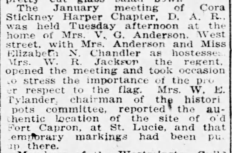 The January meeting of Cora Stickney Harper Chapter, D.A.R., was held Tuesday afternoon at the home of Mrs. V. G. Anderson, West street, with Mrs. Anderson and Miss Elizabeth N. Chandler as hostesses. Mrs. W. R. Jackson the regent, opened the meeting and took occasion to stress the importance of the proper respect to the flag. Mrs. W. E. Tylander, chairman of the historic spots committee, reported the authentic location of the site of old Fort Capron, at St. Lucie, and that temporary markings had been put up there.
