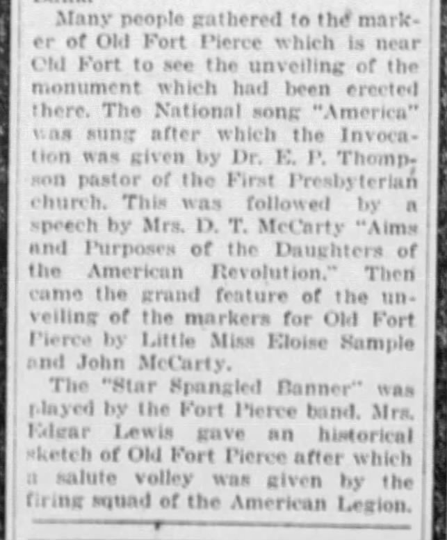 Many people gathered to the marker of Old Fort Pierce which is near Old Fort to see the unveiling of the monument which had been erected there. The National song “America” was sung after which the Invocation was given by Dr. E. P. Thompson pastor of the First Presbyterian church. This was followed by a speech by Mrs. D. T. McCarty “Aims and Purposes of the Daughters of the American Revolution.” Then came the grand feature of the unveiling of the markers for Old Fort Pierce by Little Miss Eloise Sample and John McCarty.