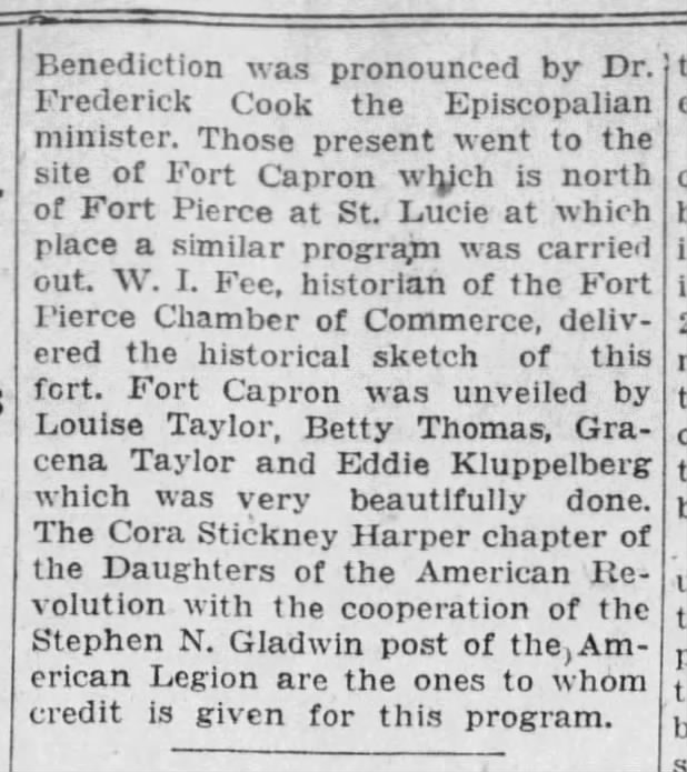 Benediction was prounounced by Dr. Frederick Cook the Episcopalian minister. Those present went to the site of Fort Capron which is north of Fort Pierce at St. Lucie at which place a similar program was carried out. W. I Fee, historian of the Fort Pierce Chamber of Commerce, delivered the historical sketch of this fort. Fort Capron was unveiled by Louise Taylor, Betty Thomas, Gracena Taylor and Eddie Kluppelberg which was very beautifully done. The Cora Stickney Harper chapter of the Daughters of the American Revolution with the cooperation of the Stephen N. Gladwin post of the American Legion are the ones to whom credit is given for this program.